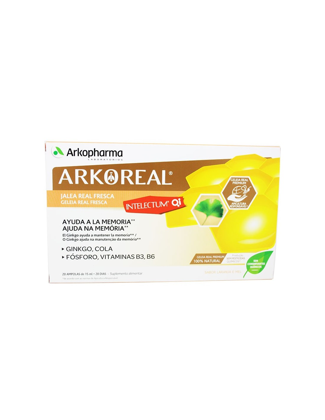 Complemento alimenticio a base de Jalea Real, extractos de Ginkgo y Kola, Fósforo y Vitamina B3 (Niacina) y B6 (Piridoxina). Con azúcares y edulcorantes.